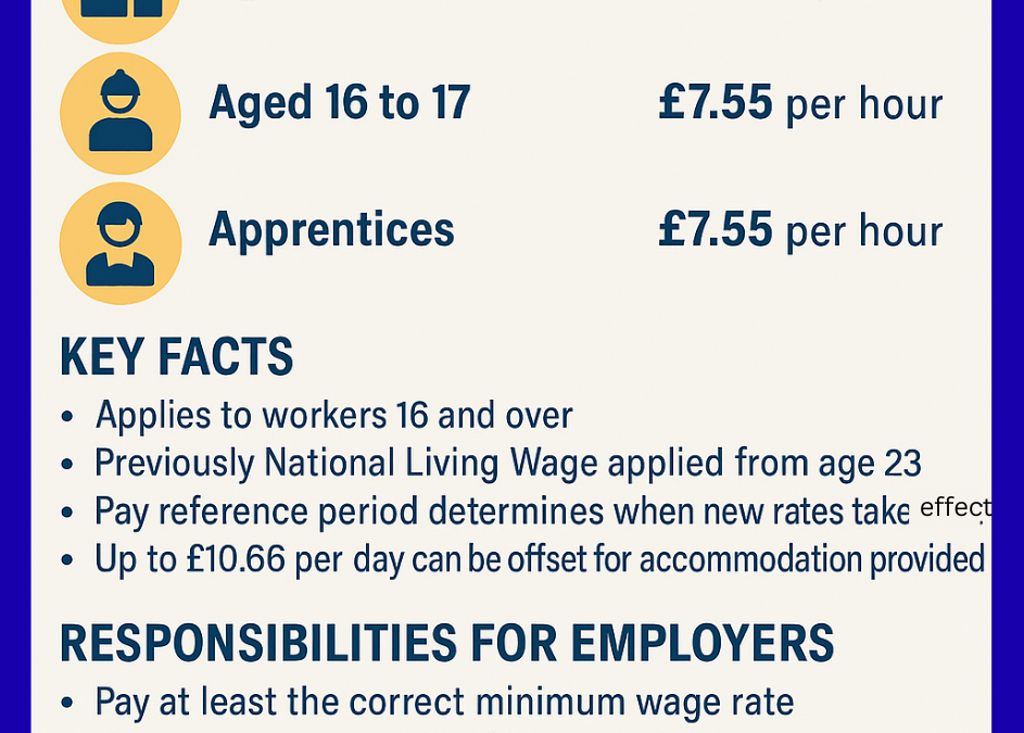 “This infographic titled ‘National Minimum Wage 2025-26: What Employers in Essex & East London Need to Know’ outlines the new UK wage rates effective from 1 April 2025. It displays key figures — £12.21 for workers aged 21 and over, £10.00 for ages 18–20, and £7.55 for both 16–17-year-olds and apprentices. It highlights essential employer responsibilities, including paying at least the correct rate, keeping accurate records, and rectifying any underpayments. The design also mentions the £10.66 daily accommodation offset and visually reinforces compliance for small businesses.”