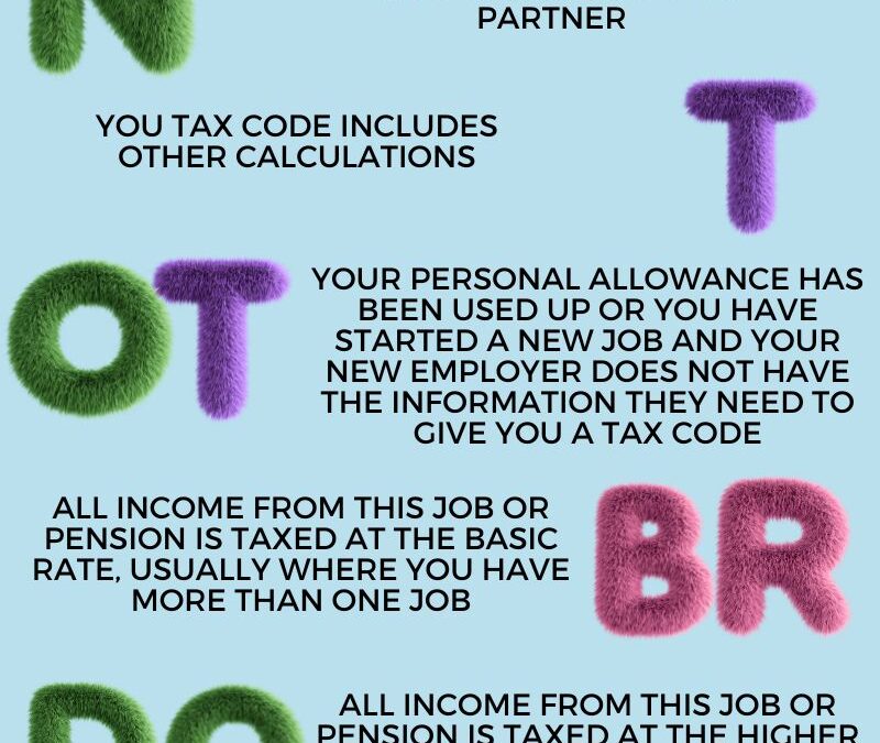 Infographic explaining the meaning of UK tax code letters including L, M, N, T, BR, D0, D1, and K — created by Trueman Brown Accountants.